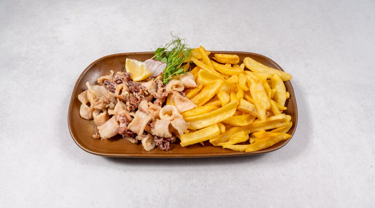 Divlja riba, lignje, škampi, rošpo, pedoči, kanaštrele, blitva i krumpir