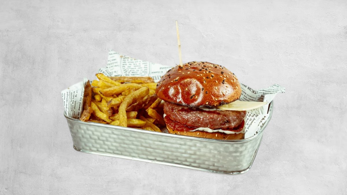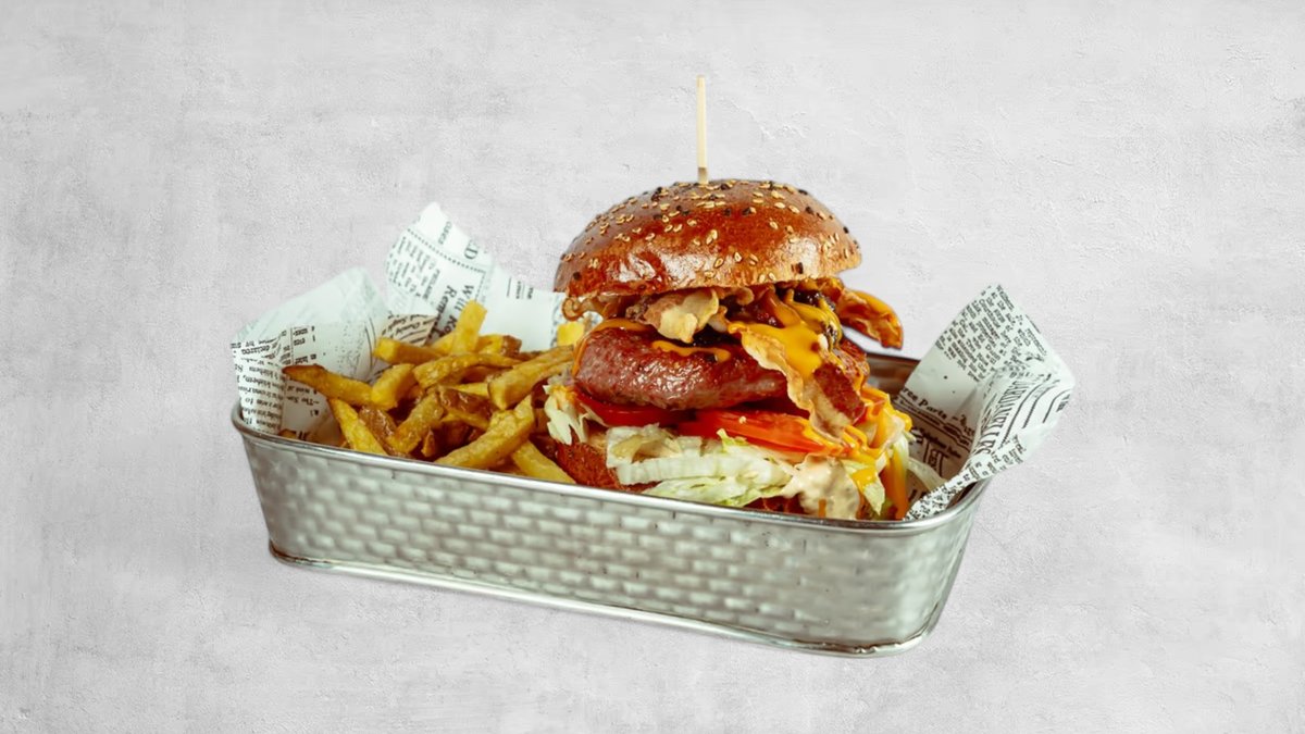 Pljeskavica od 100% junetine, majoneza s tartufima, ragu od gljiva, domaća dimljena kobasica, listići grana padana, pommes frites