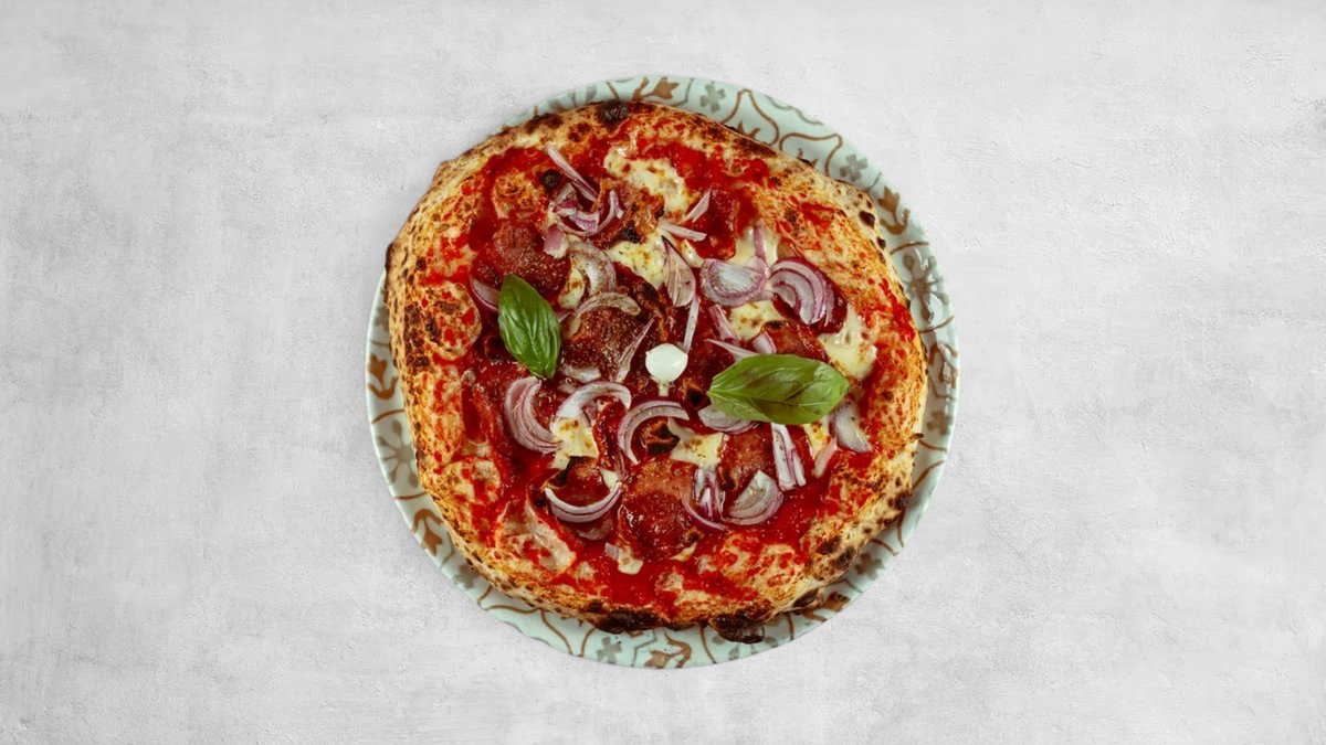 San Marzano pelati, fior di latte mozzarella, salama zimska, pepperoni piccante, ljubičasta kapula, origano