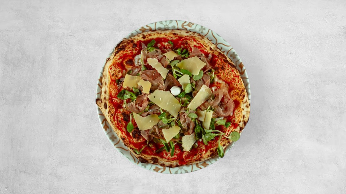 San Marzano pelati, fior di late mozzarella, kozice u tršćanskom umaku, pršut od tune, matovilac, listići grana padana