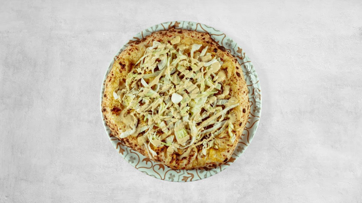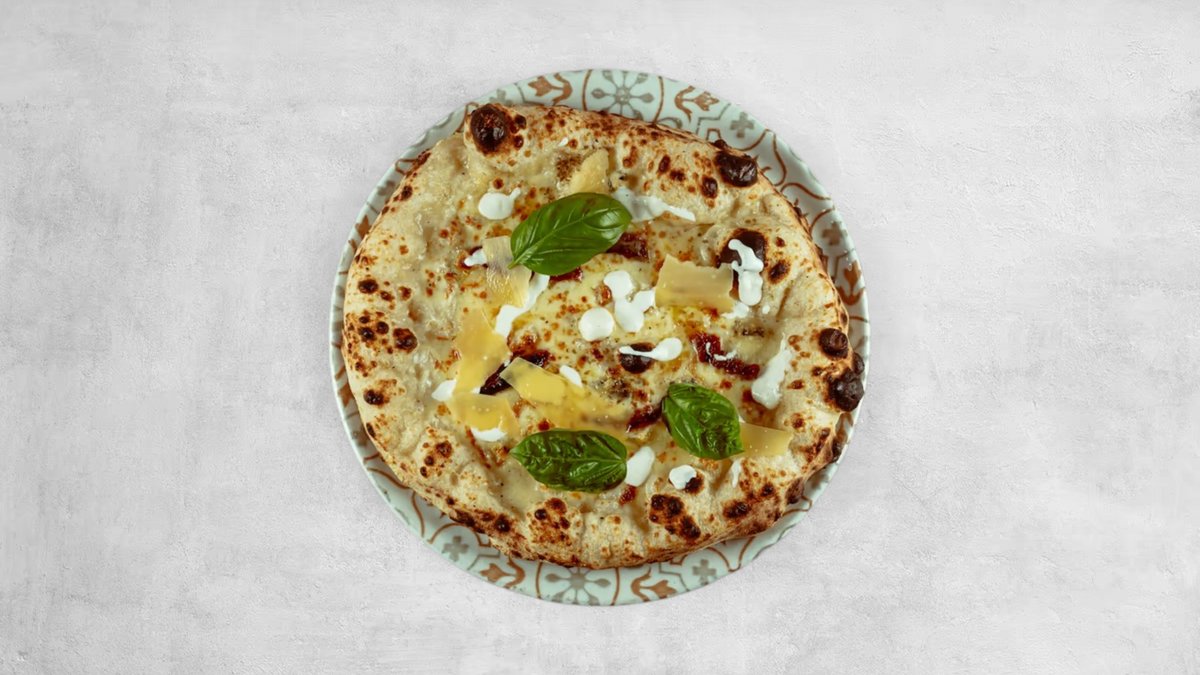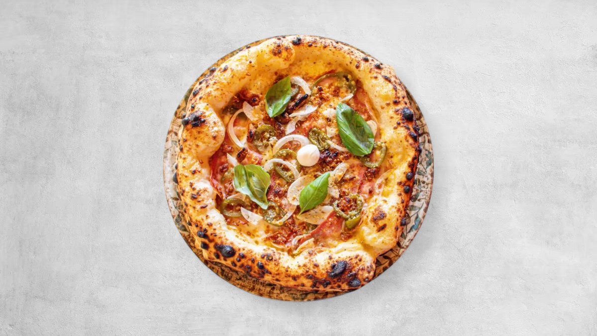 Pelati od žute pome, fior di latte mozzarella, baranjski kulen, crumble od čvaraka, svježe jalapeno papričice, parmezan, kapula, origano