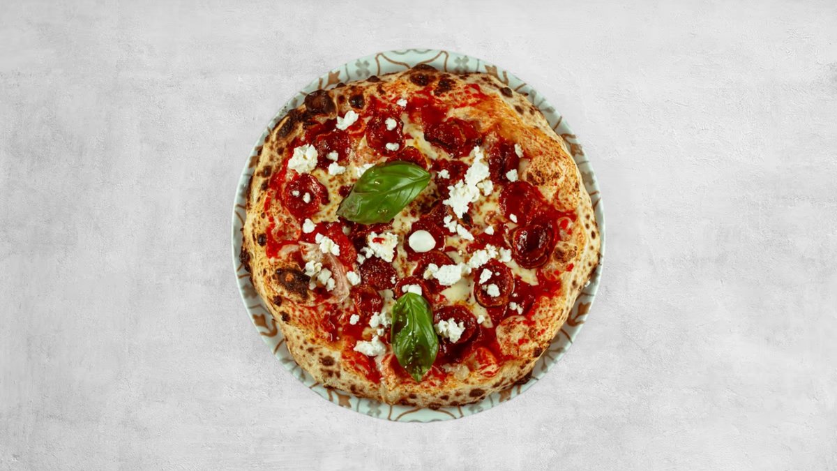 San Marzano pelati, fior di latte mozzarella, pepperoni salama, feta sir, javorov sirup, origano