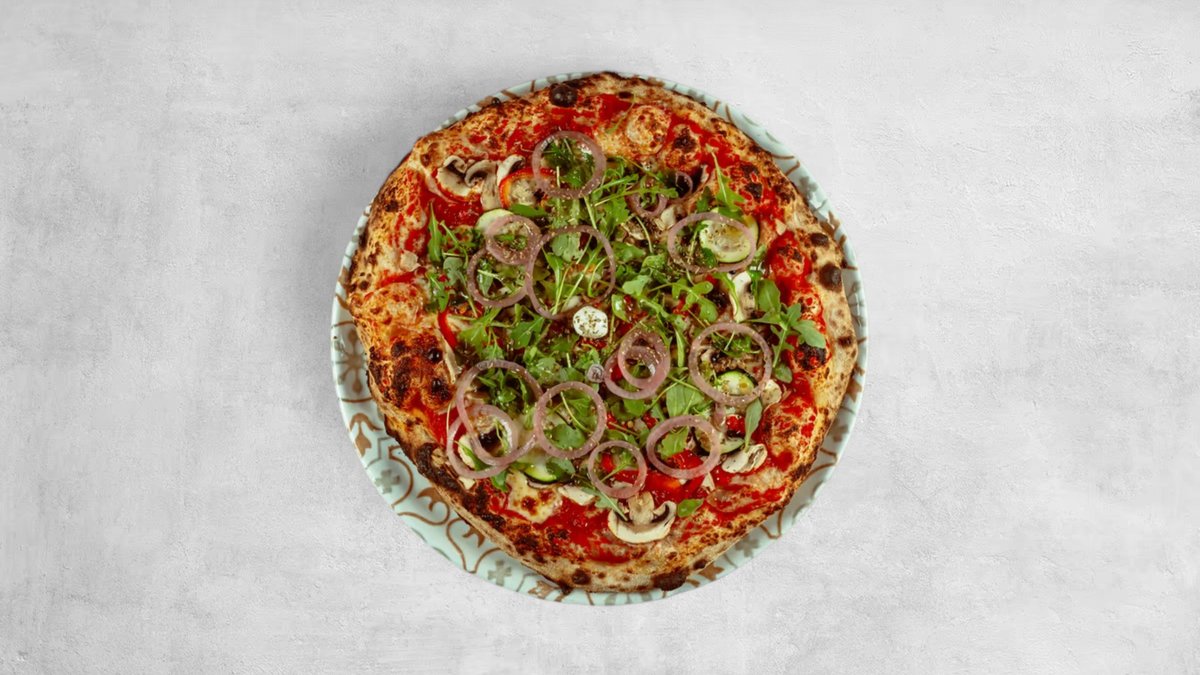 San Marzano pelati, fior di latte mozzarella, paprika, tikvica, gljive, rikula, ukiseljena kapula, origano