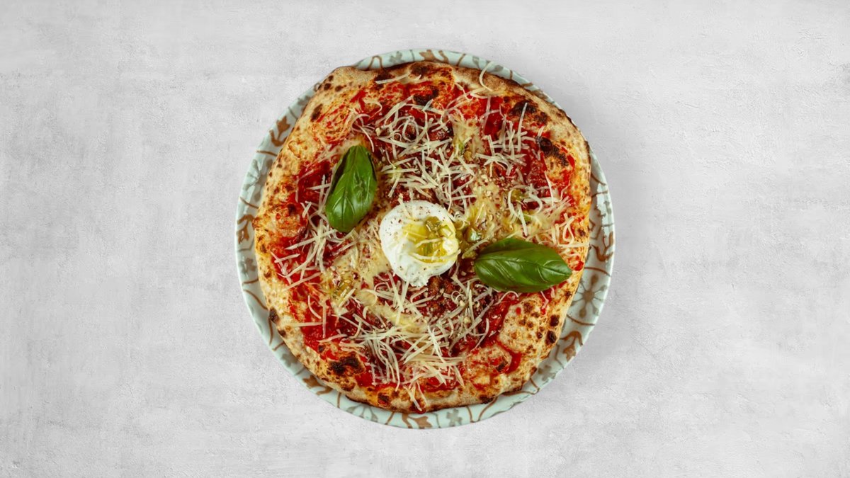 Dva napoletanska klasika u jednoj pizzi; 1/2 Marinara (San Marzano pelati, češnjak, origano, maslinovo ulje, crni papar, bosiljak), 1/2 Margherita (San Marzano pelati, fior di latte mozarella, maslinovo ulje, bosiljak)