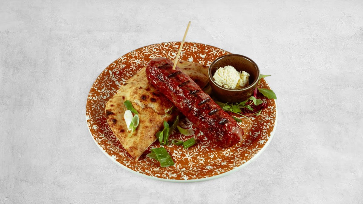 Ćevap punjen mozzarellom, dalmatinskom pancetom (300g) serviran sa somunom i kajmakom