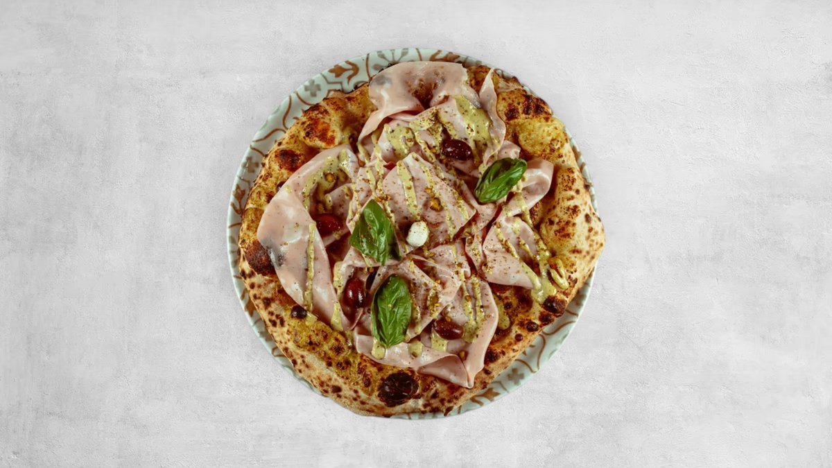 Krema od pistacia i bosiljka, fior di latte mozzarella, mortadela di Bologna, mljeveni pistacio, grčke kalamata masline