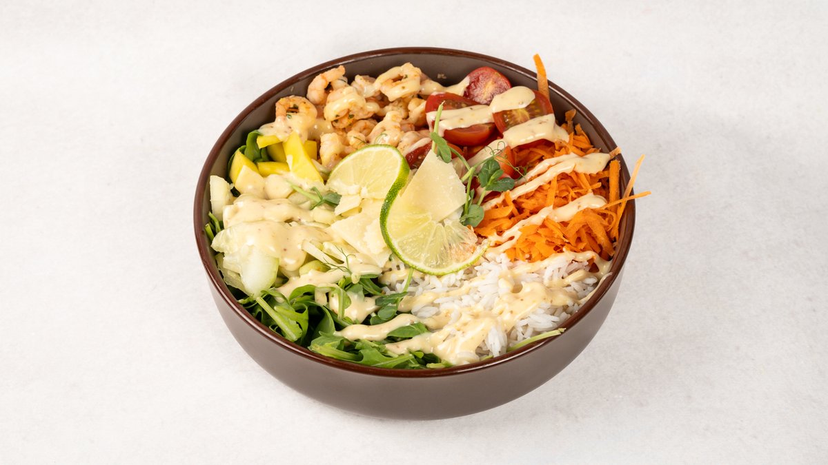 Ovdje stvarno možeš uživati u kozicama jer ih ne dobiješ samo par, već 150 grama pripremljenih na kokosovom ulju bez okusa i mirisa! U kombinaciji s rikolom, basmati rižom, ribanom mrkvom, grana padanom, cherry rajčicama, svježim krastavcima i mangom imaš morsku salatu iz snova, posebno kad na to sve dodamo umak - od senfa i meda!