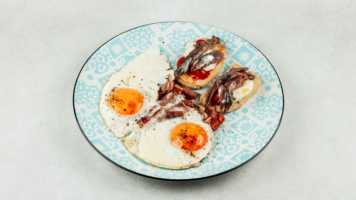 Jaja na oko, panceta ili pršut, mala bruschetta rajčicom, mozarellom i inćunom