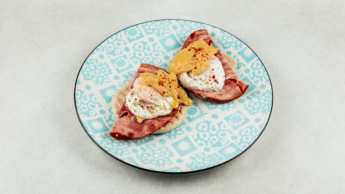 Kruh, pečena šunka, poširano jaje, benedict umak
