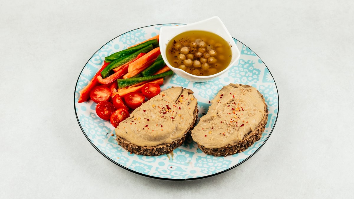 Poprženi crni kruh sa sjemenkama, humus, svježe sezonsko povrće