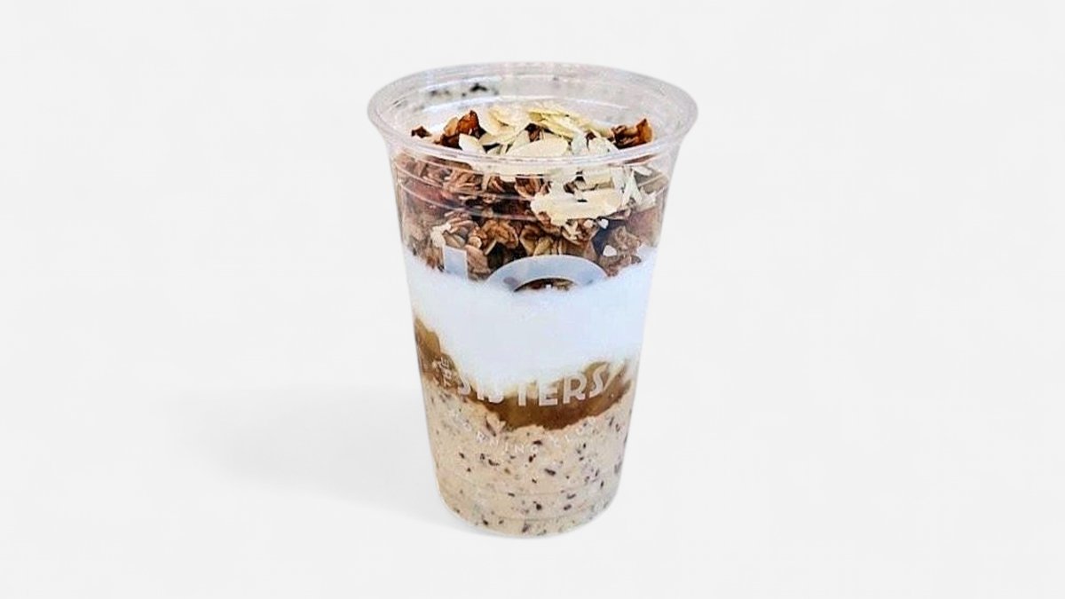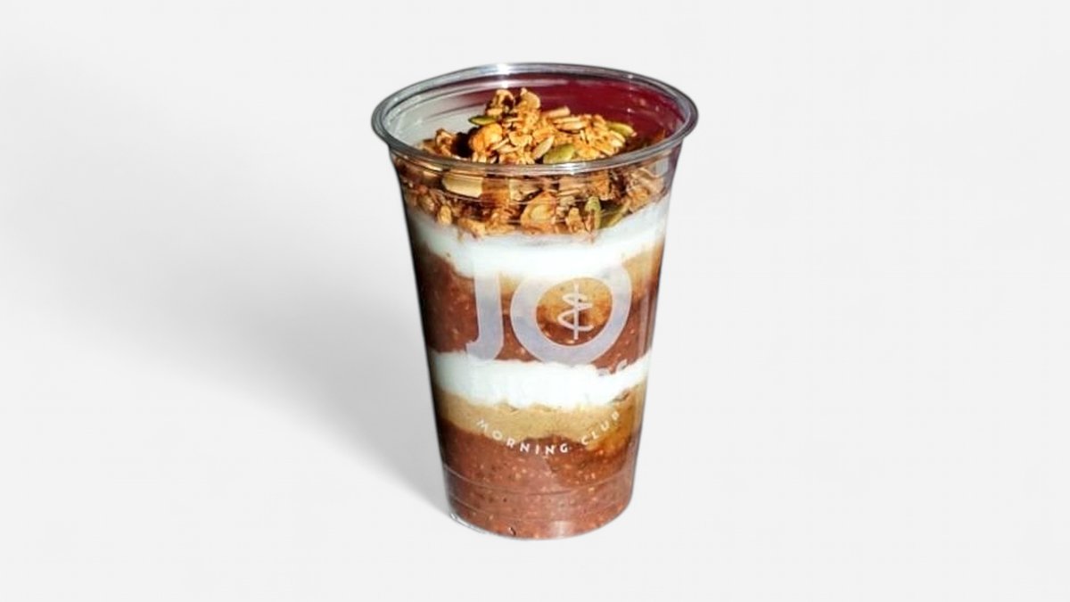 domaće mlijeko od indijskog oraha, zob, mljeveni lan, chia, protein vanilja, sirovi kakao, domaći karamel od datulja, slani kikiriki, kokos jogurt, domaća granola