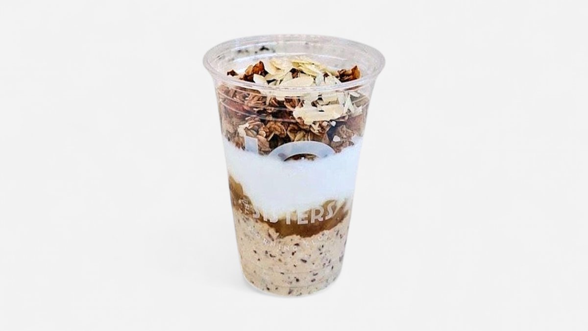 domaće mlijeko od indijskog oraha, zob, mljeveni lan, chia, protein vanilija, sirovi kakao, domaća karamela od datulja, slani kikiriki, kokos jogurt, domaća granola