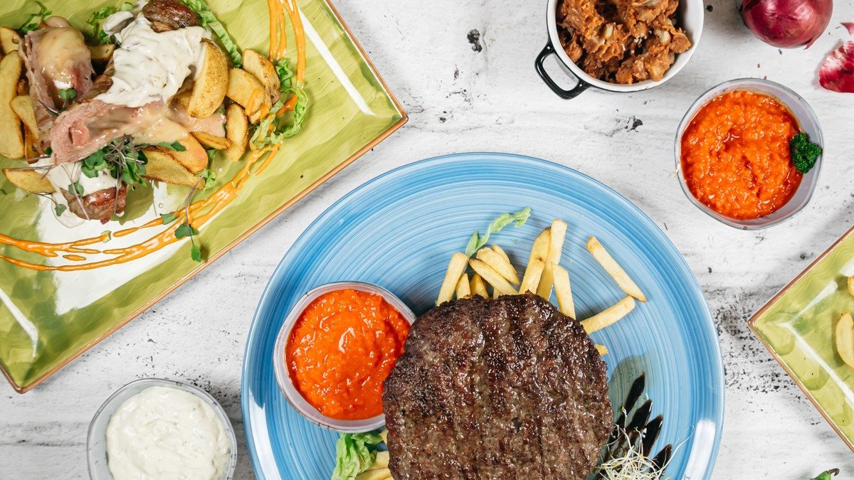 Pljeskavica s dodatkom luka, gouda, panceta, mješavina začina, pommes frites, ajvar