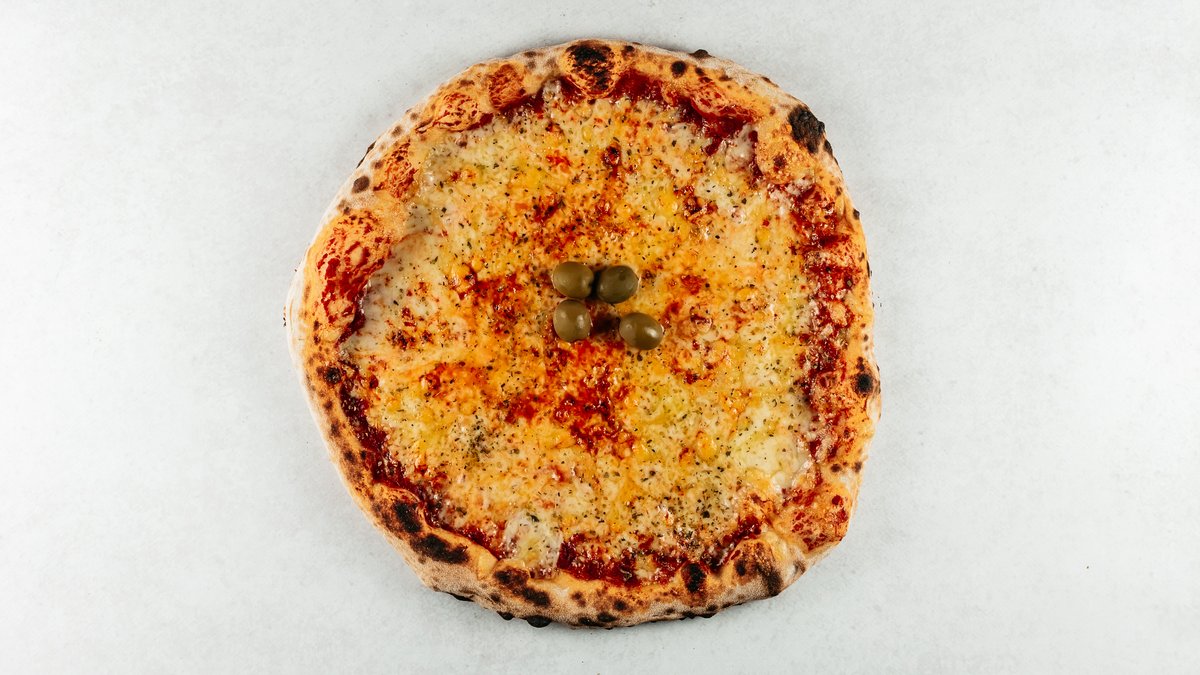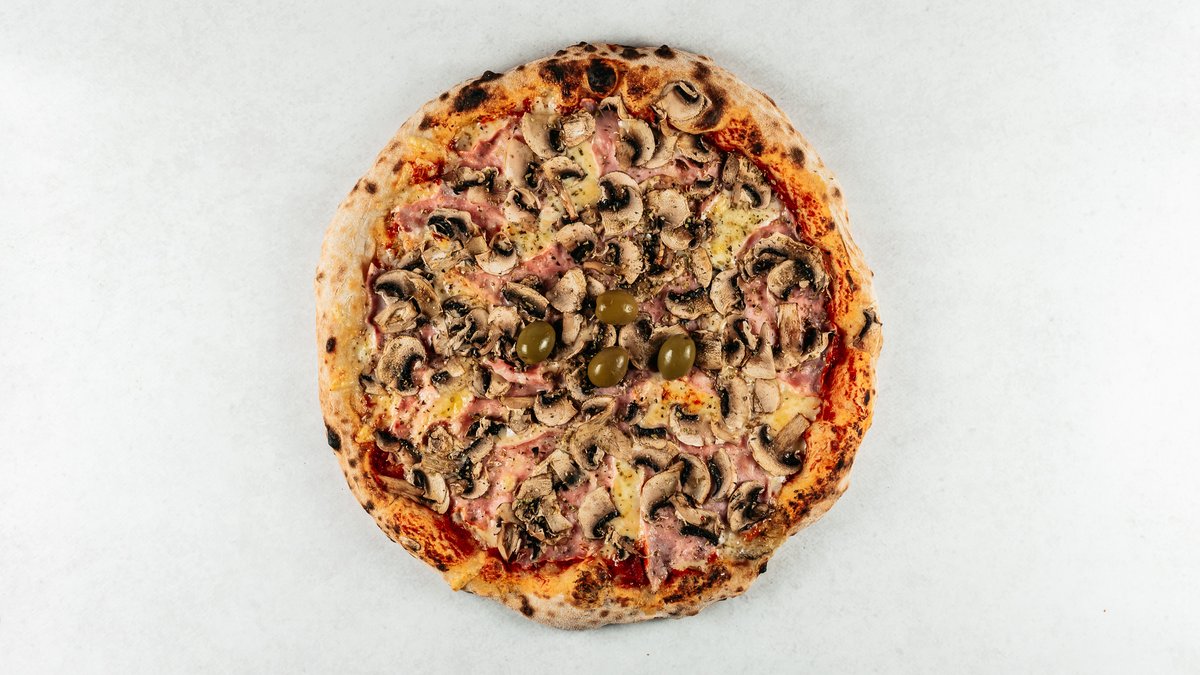 Umak od rajčice, sir, gljive, tikvice, paprika, crveni luk, kukuruz, masline