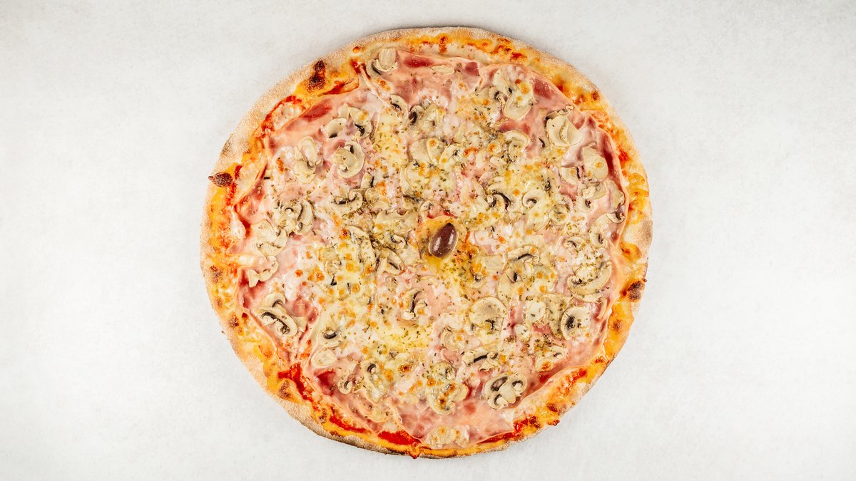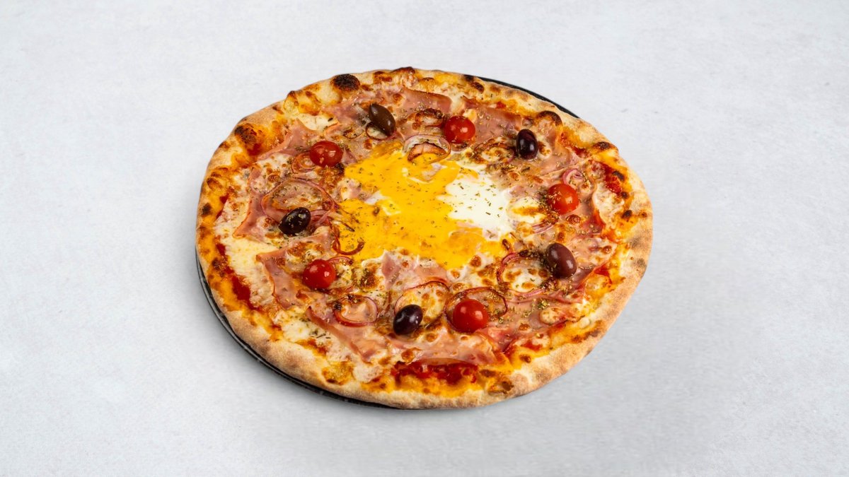 Pelati, mozzarella, šunka, panceta, jaje, crveni luk, cherry rajčice, maslina, origano