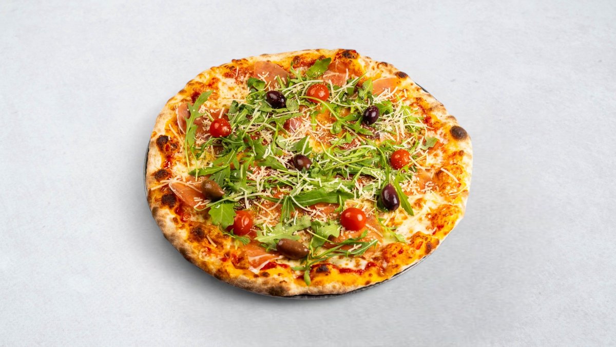 Pelati, mozzarella, tvrdi sir, crne masline, pršut, rikula, maslinovo ulje, cherry rajčice