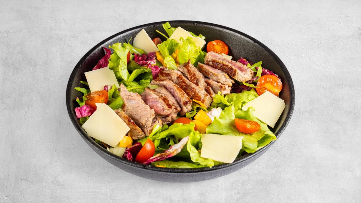 Junetina, svježa zelena salata, radič, rikula, rajčica, tvrdi sir, krutoni