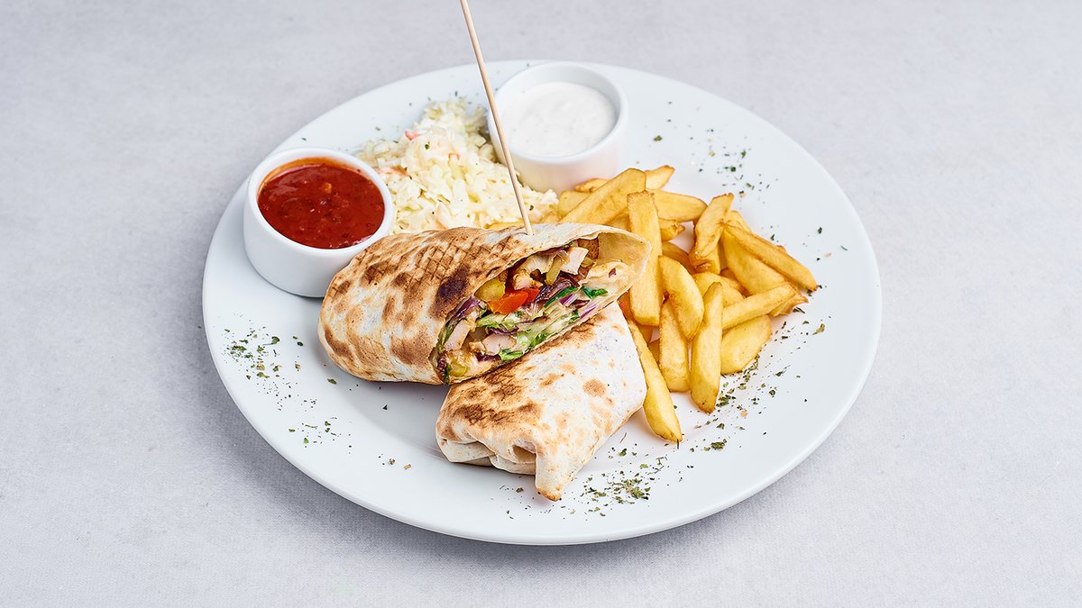Mljevena piletina, povrće, ljuti začini, luk umak, salata, rustikalni krumpir, libanonski kruh