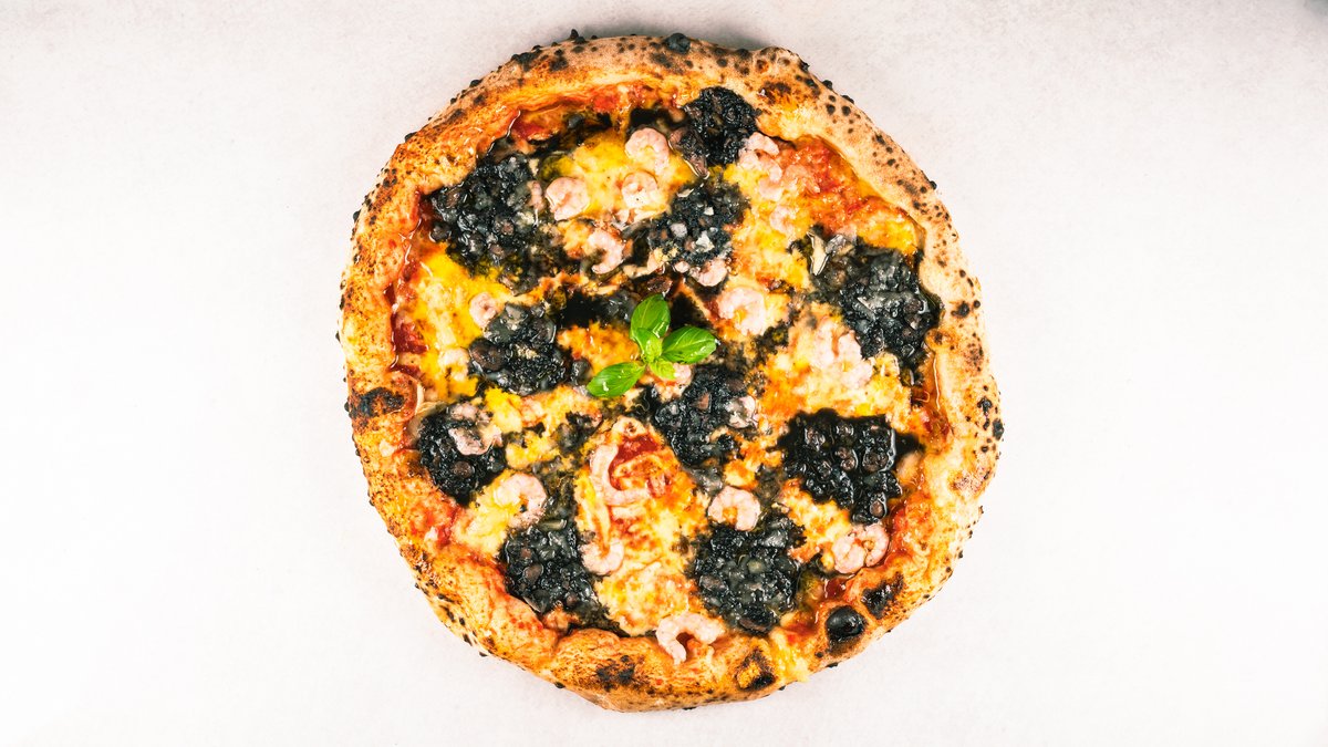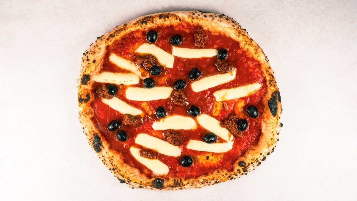 Pelati, mozzarella fior di latte, crne masline, pesto genovese