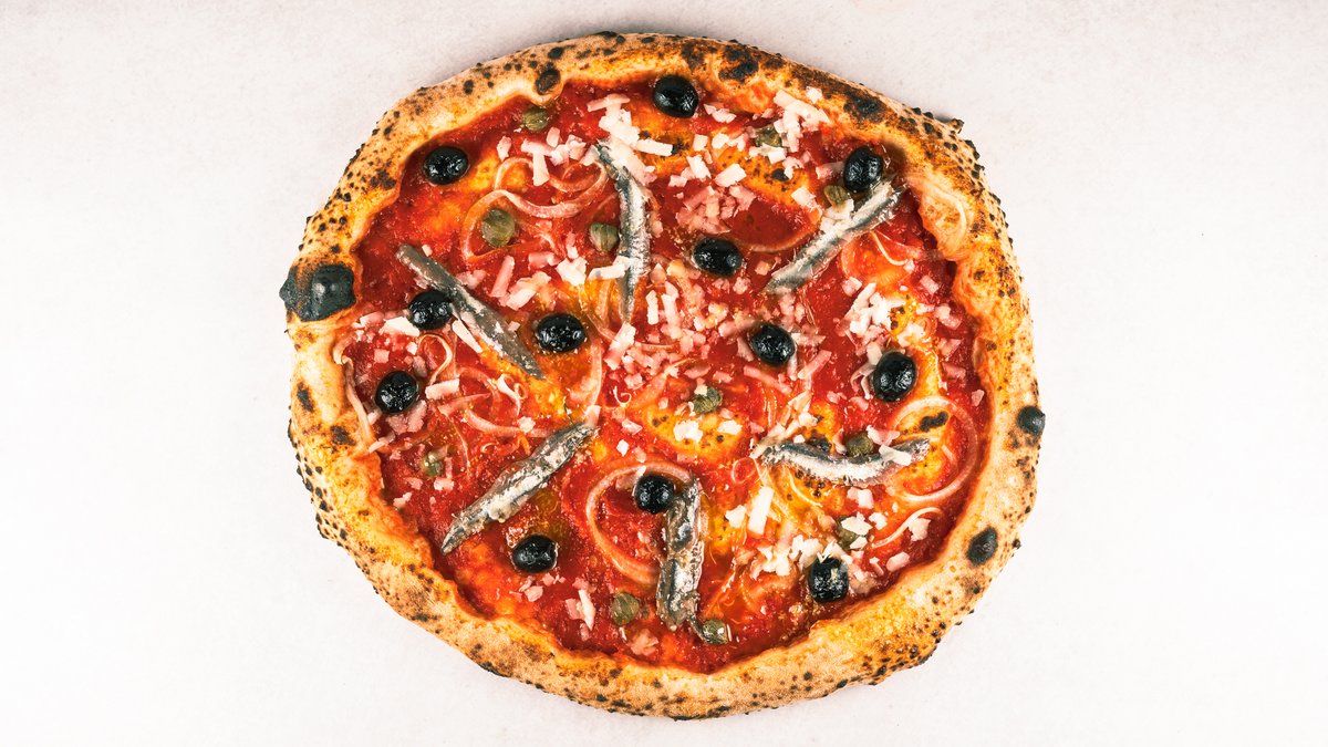 Pelati, fileti inćuna, kapula, crne masline, kapari, češnjak, maslinovo ulje, parmezan