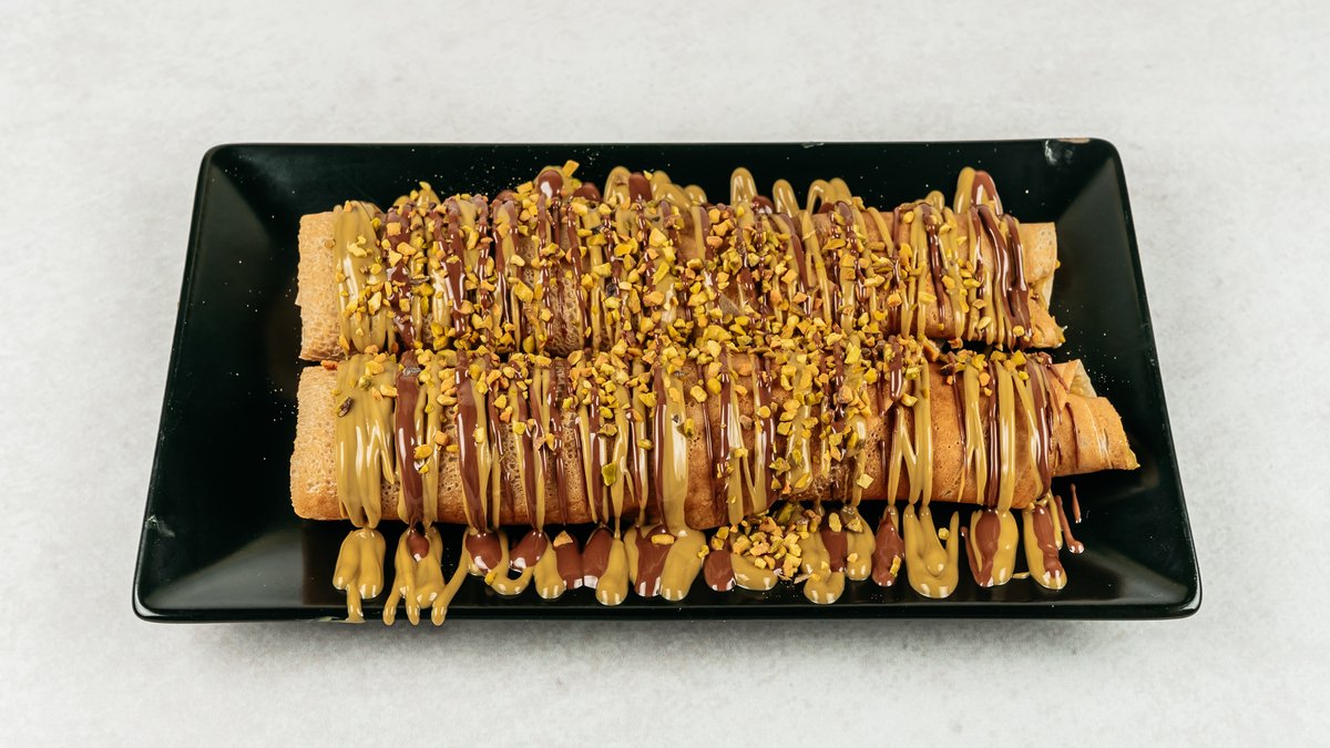 Velika palačinka, bijela Linolada, pistacio namaz, čokoladni preljev, sjeckani pistacio *slika je simbolična