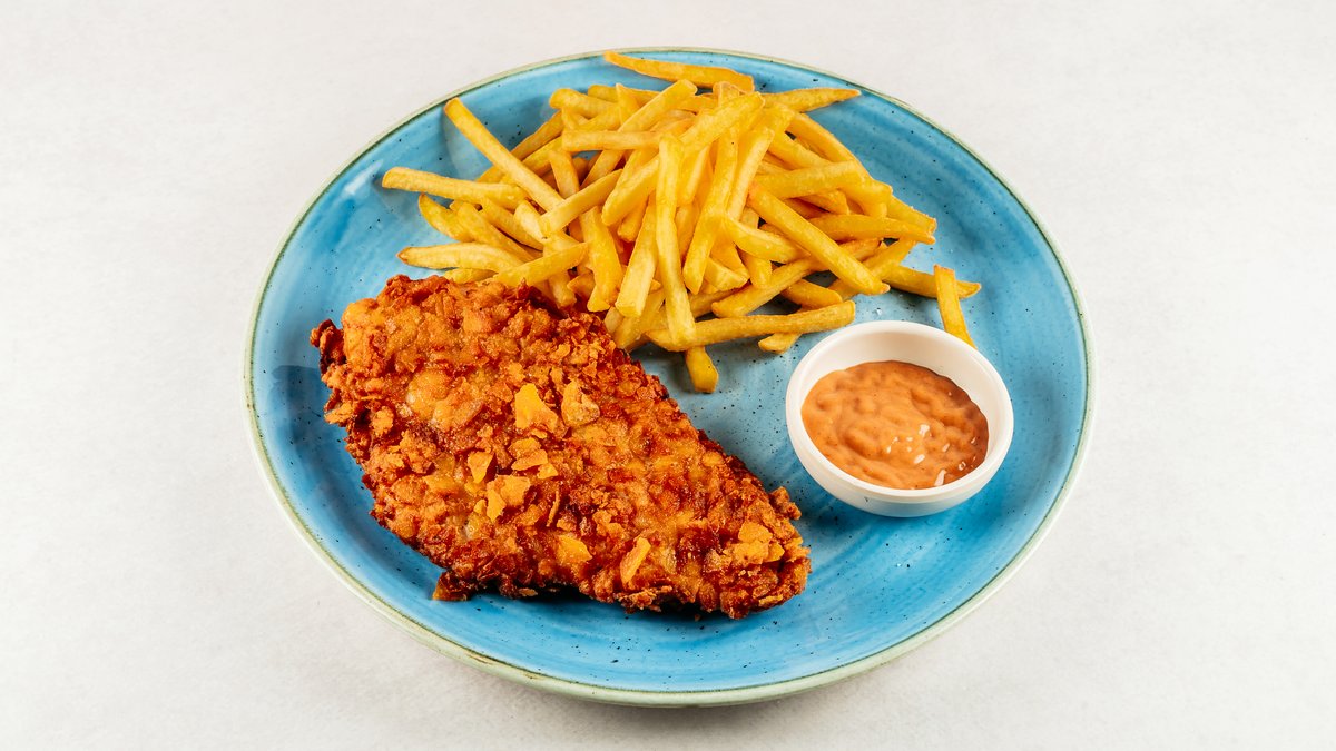 Pohana piletina u ÄŤipsu s pommes fritesom
