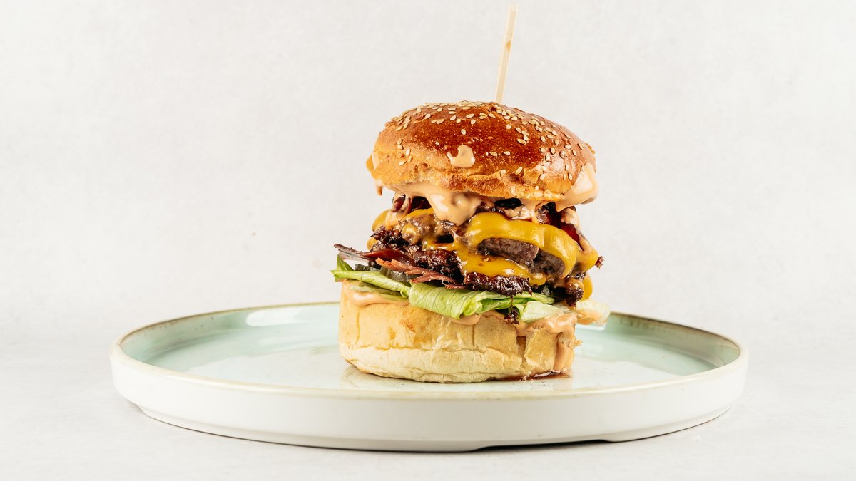 Brioche pecivo, 2x junetina (100g), sir, panceta, karamelizirana kapula, salata, rajčica, kiseli krastavac, domaći burger umak