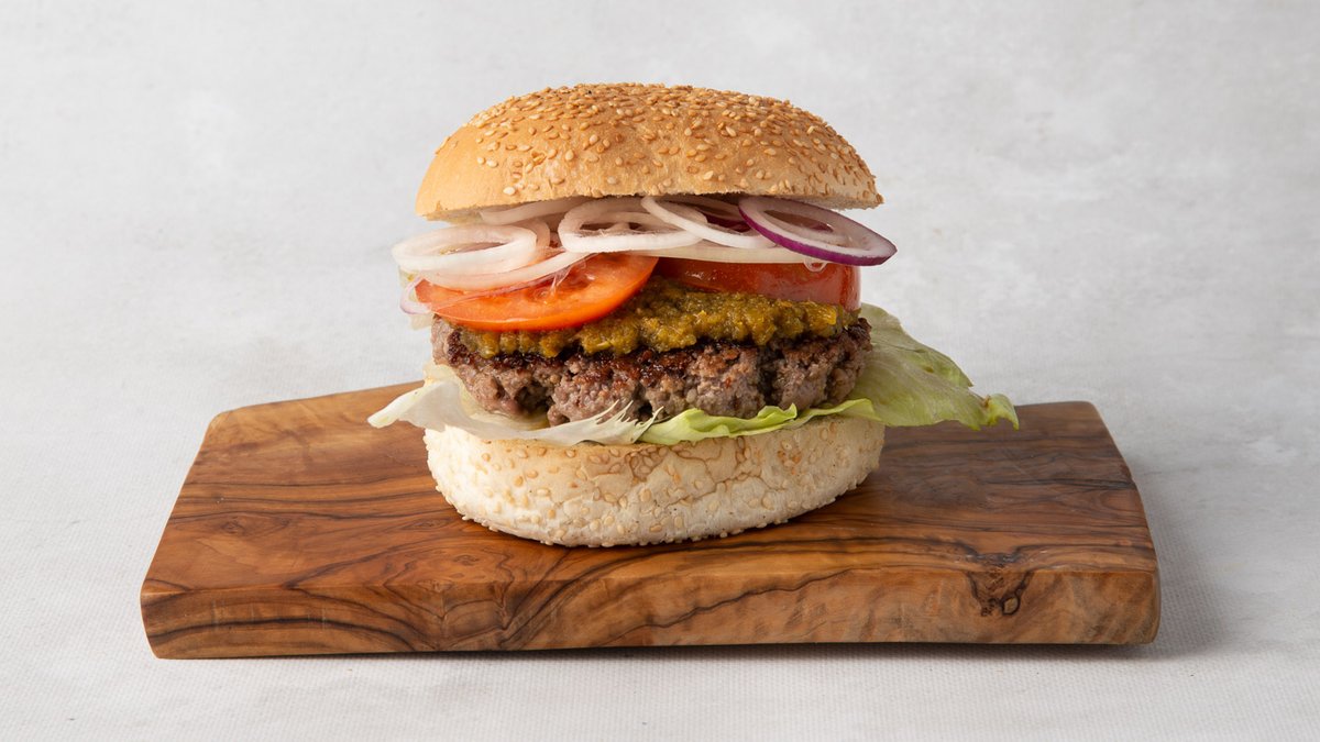 100% domaći burger od junetine, zelena salata, rajčica, mozzarella, džem od luka, Italian green umak *slika je simbolična