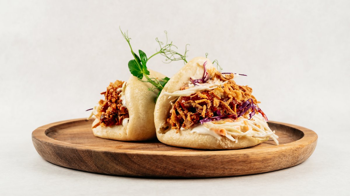 Pšenično pareno tijesto , tempeh u marinadi od aromatičnih začina, coleslaw, bbq umak, prženi luk , mayo