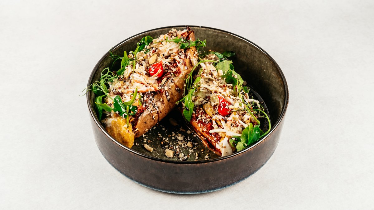 Pečeni batat punjen kremom od sušenih rajčica, cheddar umak, coleslaw, quinoa *gluten free
