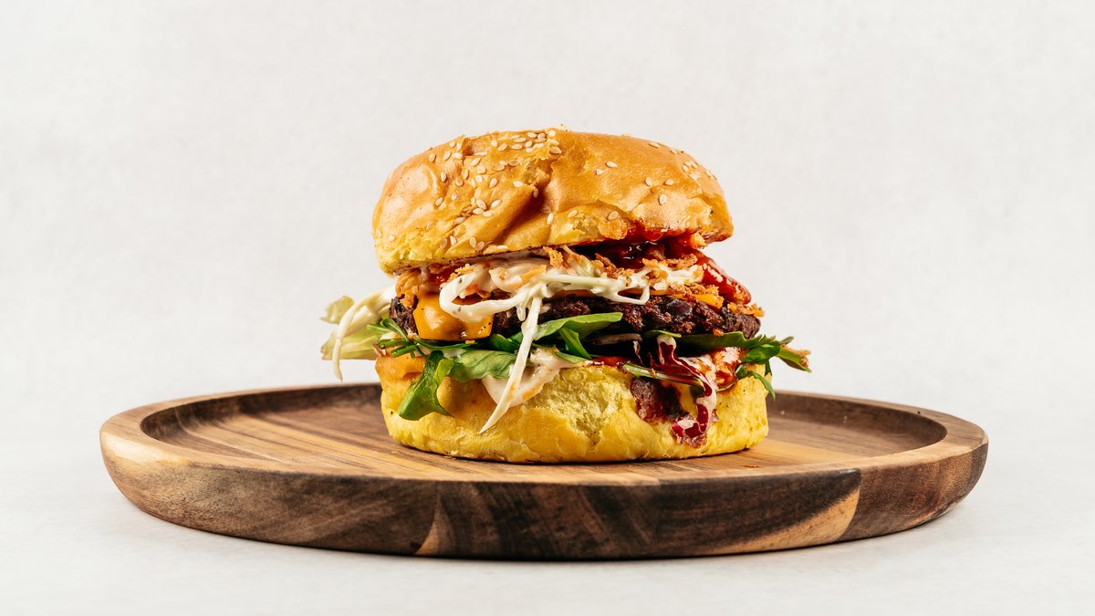 Polpeta od graha, gljiva i oraha , cheddar sir , coleslaw, prženi luk, salata , bbq umak