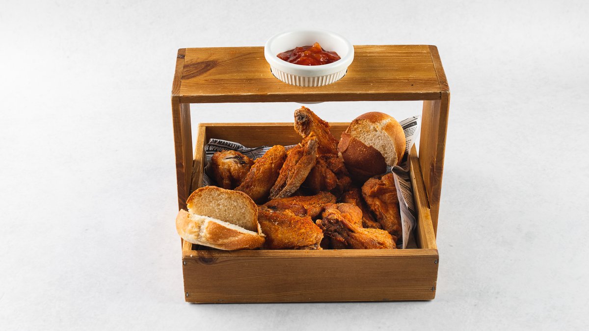 Pileća pljeskavica, Wild West umak, zelena salata, kiseli krastavci, češnjak, topljeni sir, BBQ umak, rikula, marmelada od luka, luk, ljuti umak, domaći pommes frites i prženi luk *slika je simbolična