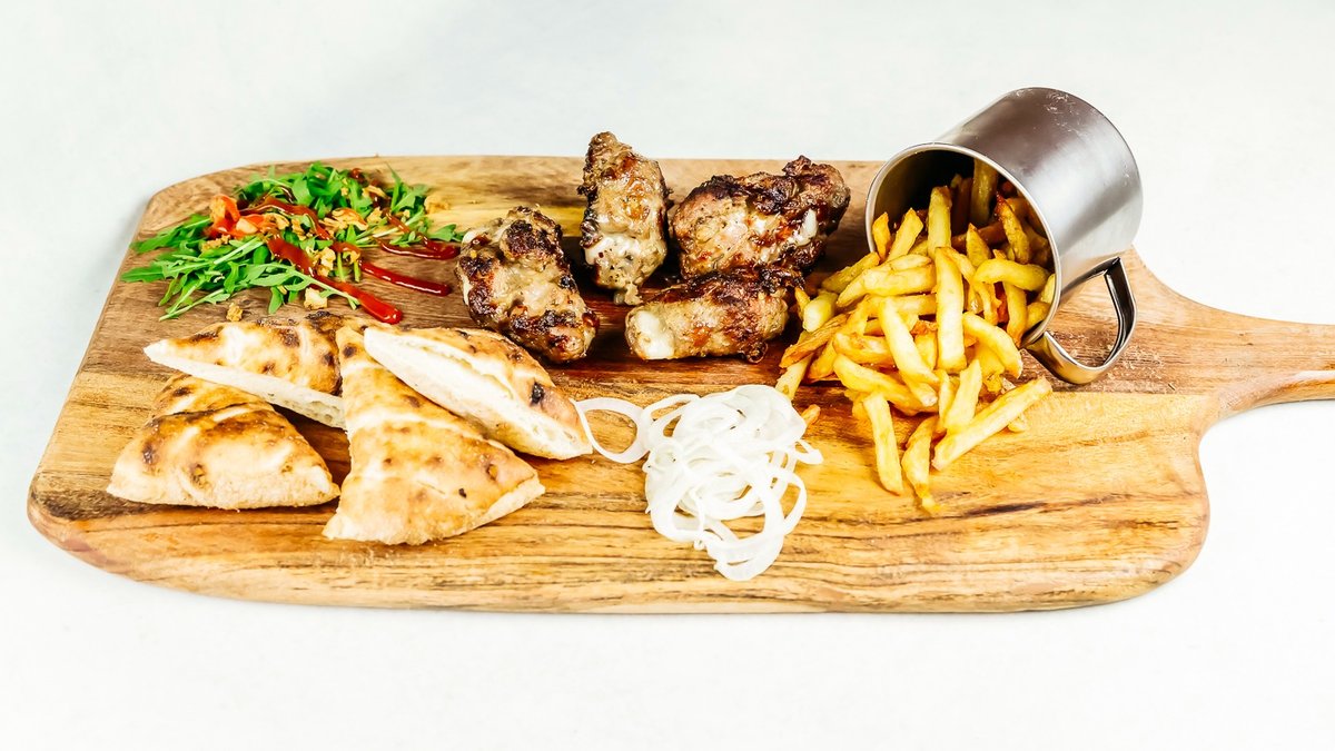 Juneća pljeskavica, tartufi, mladi luk, kiselo vrhnje, rikula, rajčica, mediteranski umak, domaći pommes frites i prženi luk *slika je simbolična