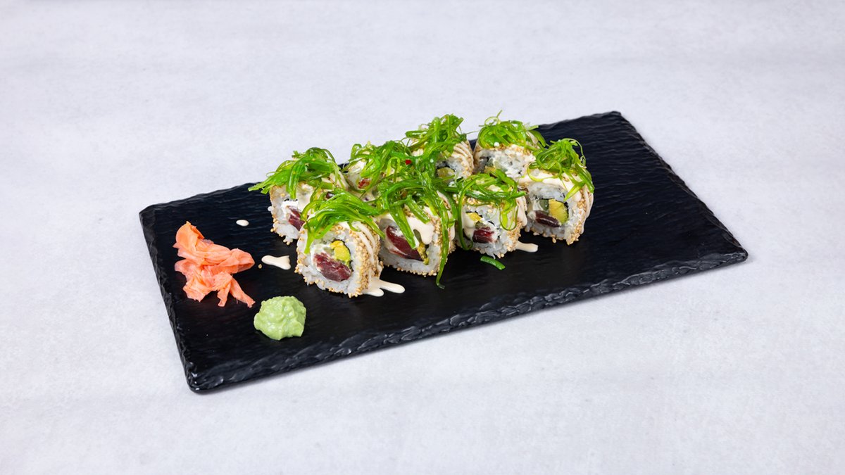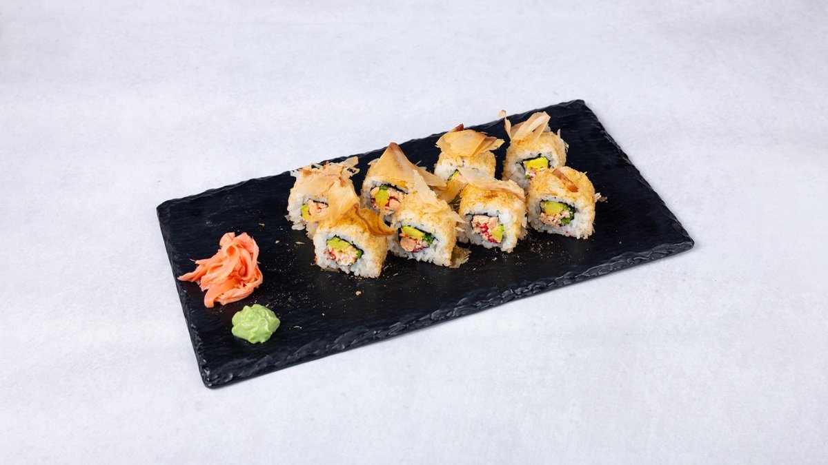 Prženi losos, ikra leteće ribe, krastavac, avokado, pahuljice od tune, 8 komada