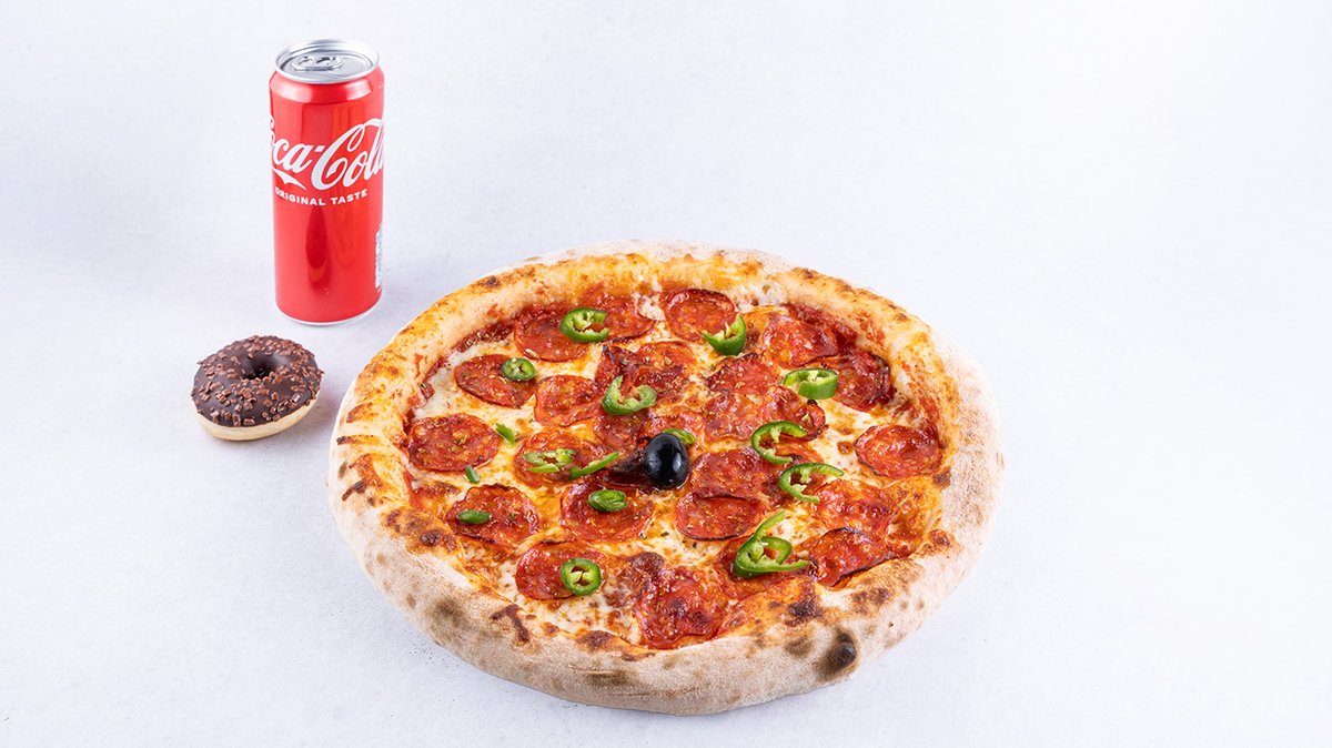 Umak od rajčice, mozzarela, ljuta kobasica, chili paprika, Coca-Cola 0,33 ml *slika je simbolična