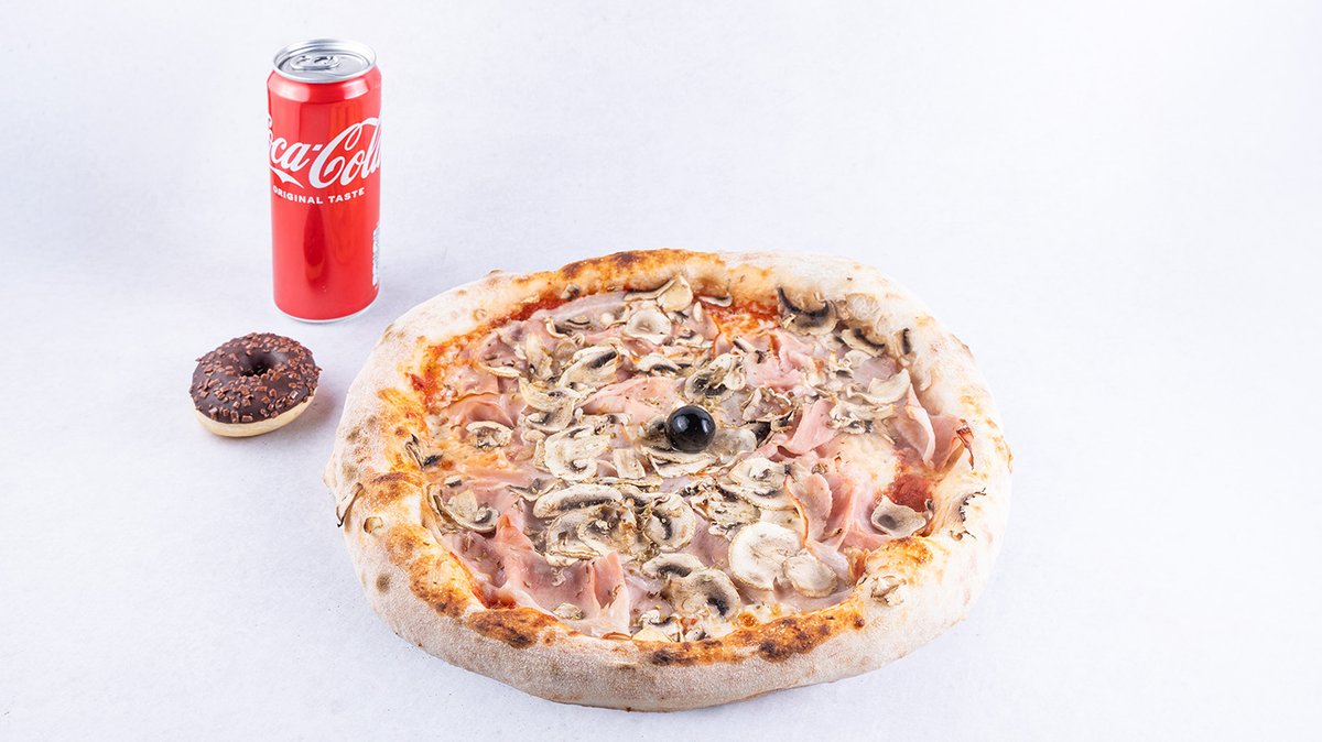 Umak od rajčice, mozzarela, šunka, gljive, Coca-Cola 0,33ml *slika je simbolična