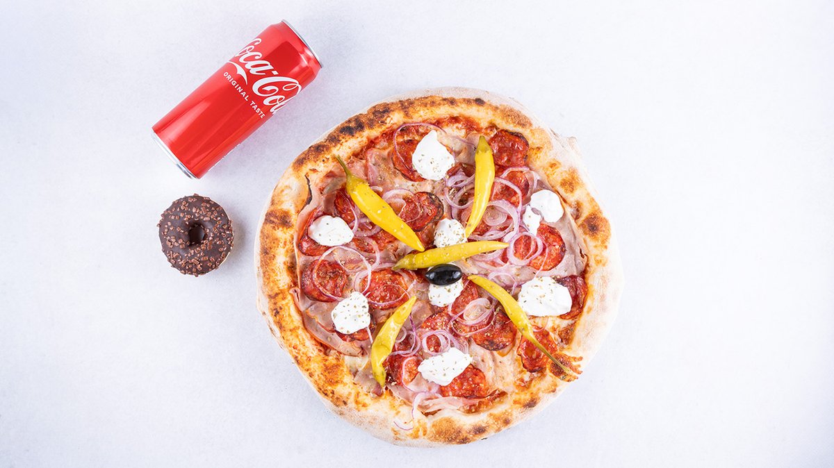 Umak od rajčice, mozzarela, šunka, panceta, kulen, luk, ljuti feferoni, vrhnje, Coca-Cola 0,33 ml *slika je simbolična