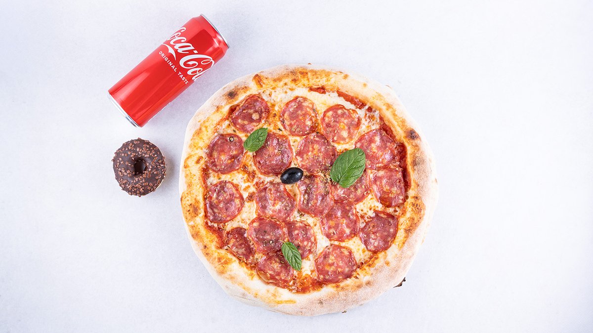 Umak od rajčice, mozzarela, salama, bosiljak, Coca-Cola 0,33 ml *slika je simbolična