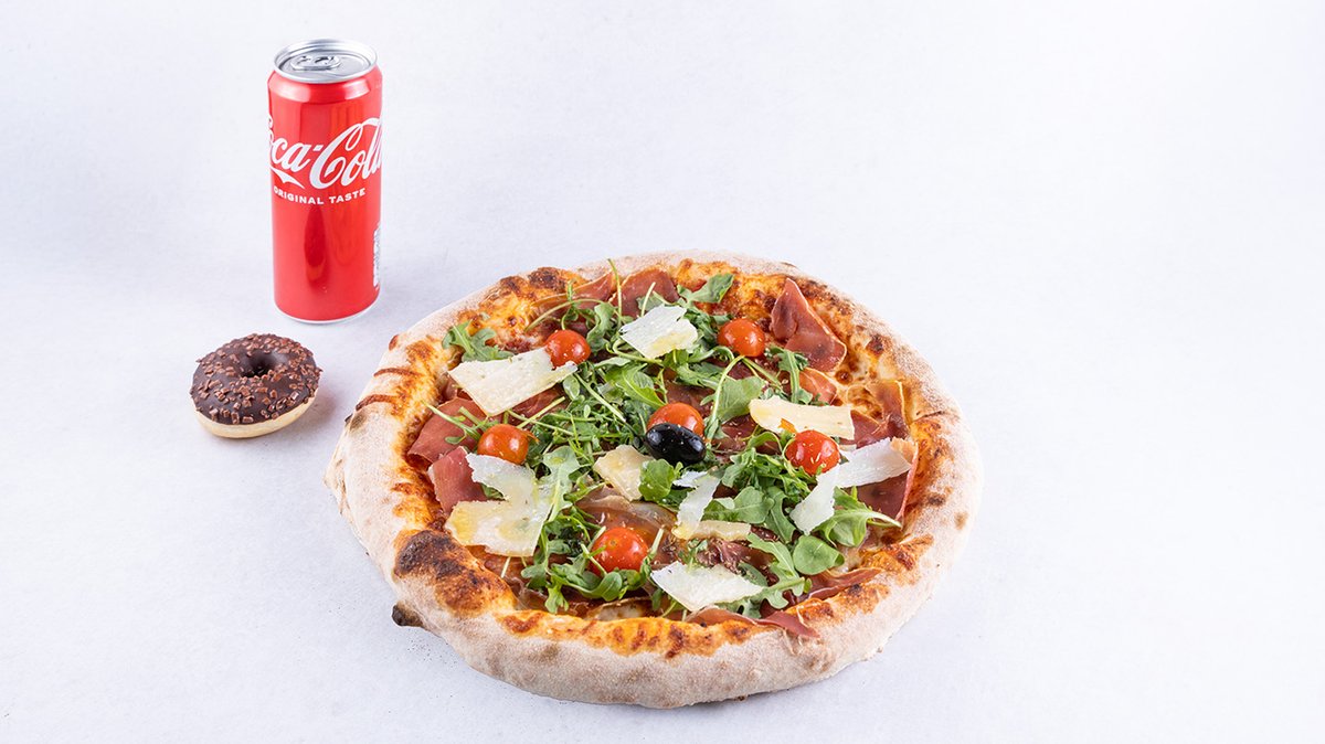 Umak od rajčice, mozzarela, pršut, rikola, Grana Padano, Coca-Cola 0,33 ml *slika je simbolična