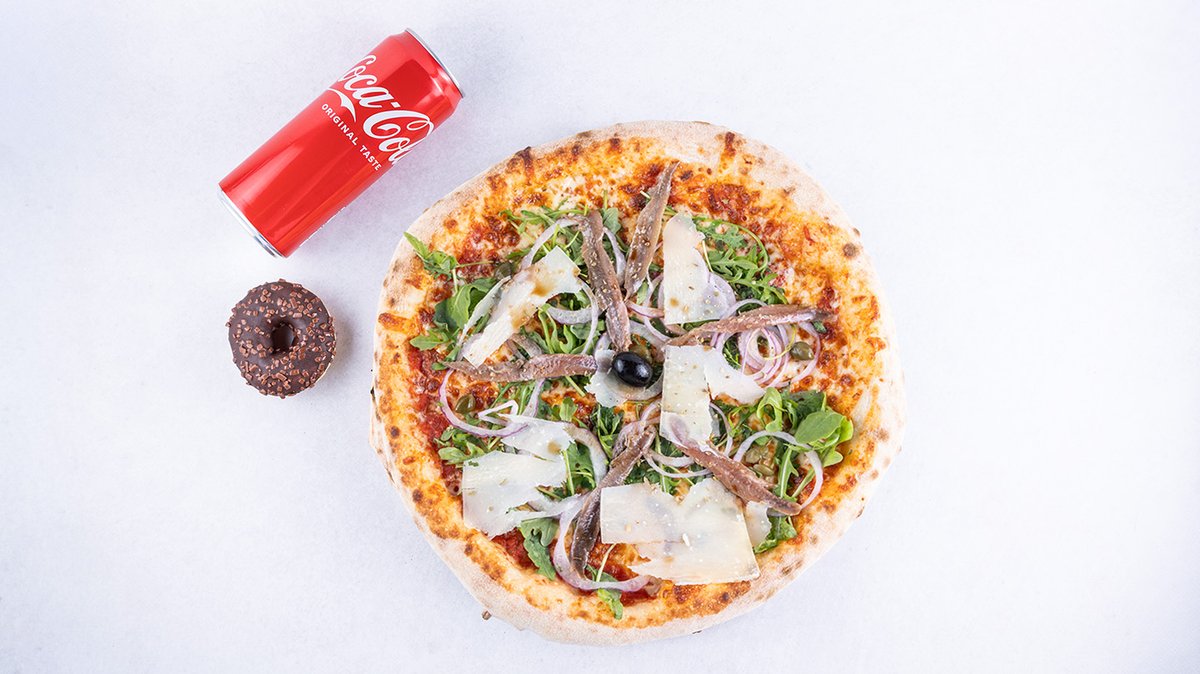 Umak od rajčice, mozzarela, inćuni, rikola, acceto balsamico, crveni luk, kapari, Coca-Cola 0,33 ml *slika je simbolična