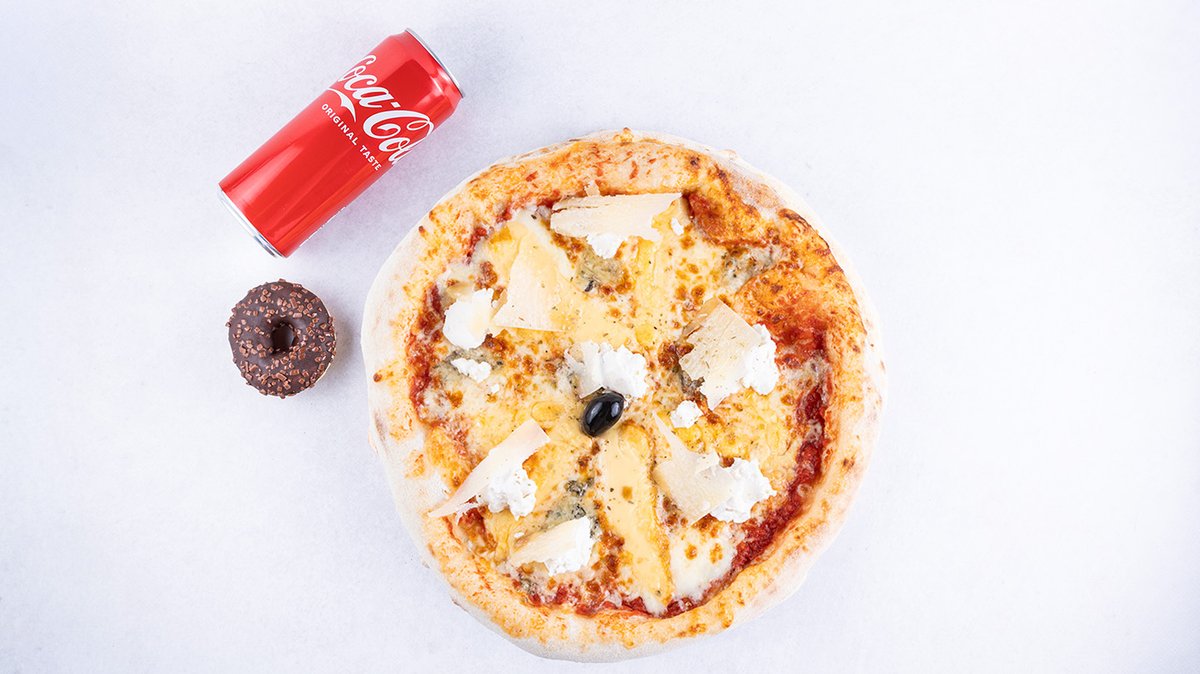 Umak od rajčice, mozzarela, burata, dimljeni sir, gorgonzola, Grana Padano, Coca-Cola 0,33 ml *slika je simbolična