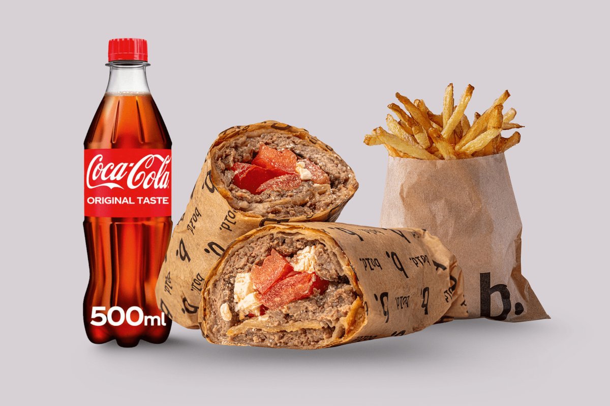 100% 'smash' junetina (150g) iz lokalnog uzgoja sa kebab začinima (harrisa začini), zapečeno s tortiljom, feta sir, rajčica, salata , domaći pommes, Coca-Cola 0,5 l *moguće je izbaciti sastojke, ali ne i dodavati nove