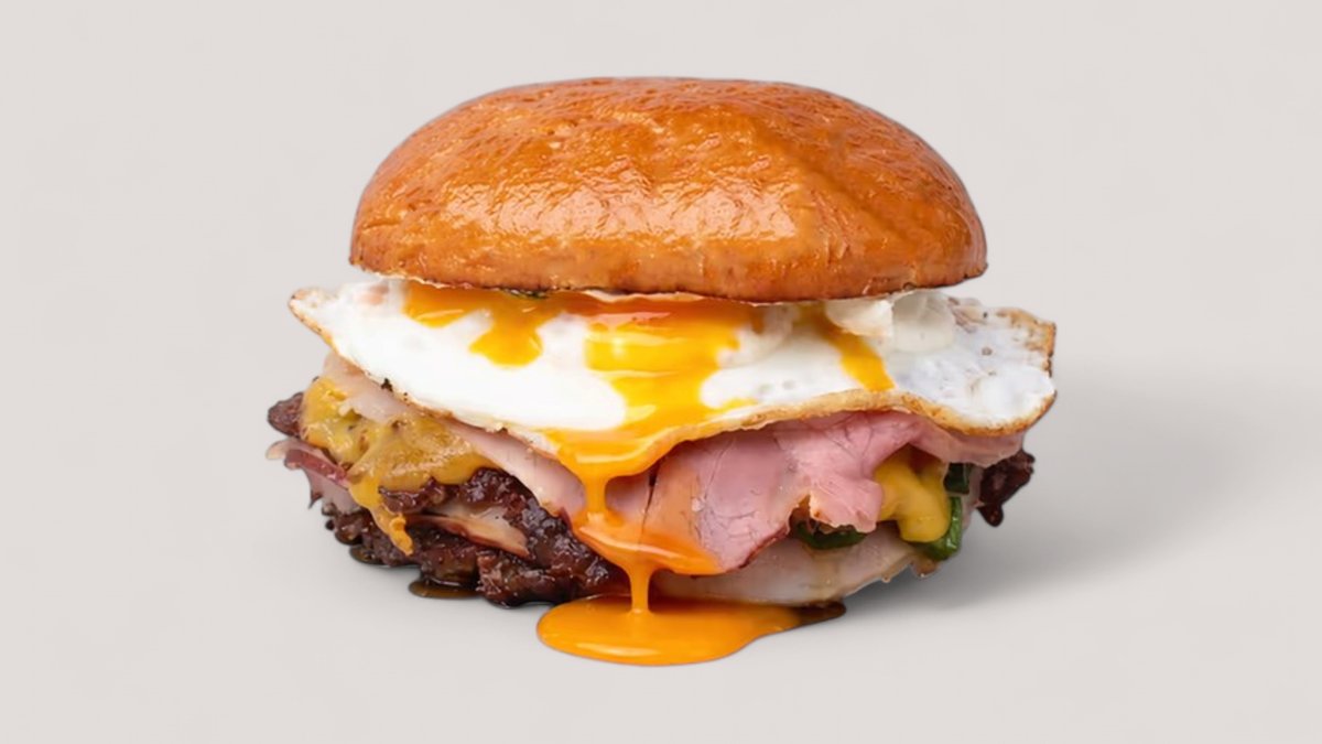 100% 'smash' junetina iz lokalnog uzgoja (150g), sir, sunka, jaje, mladi luk i Bad Bunny umak.