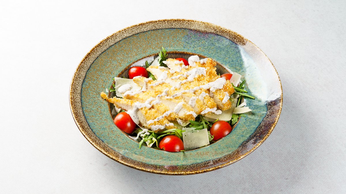 Iceberg salata, rikula, cherry rajčica, listićI grana padano, krutoni, pohani pilećI file u panku, Cesare umak