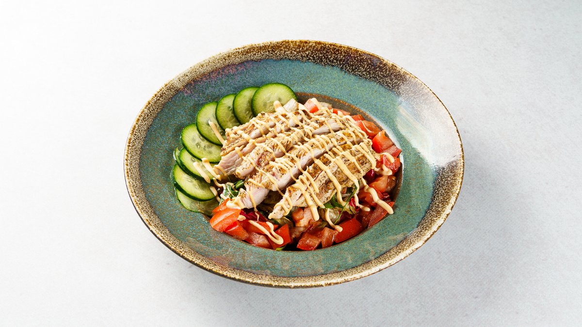 Miješana lisnata salata, svježI krastavac, rajčica, puretina grill, senf-med umak