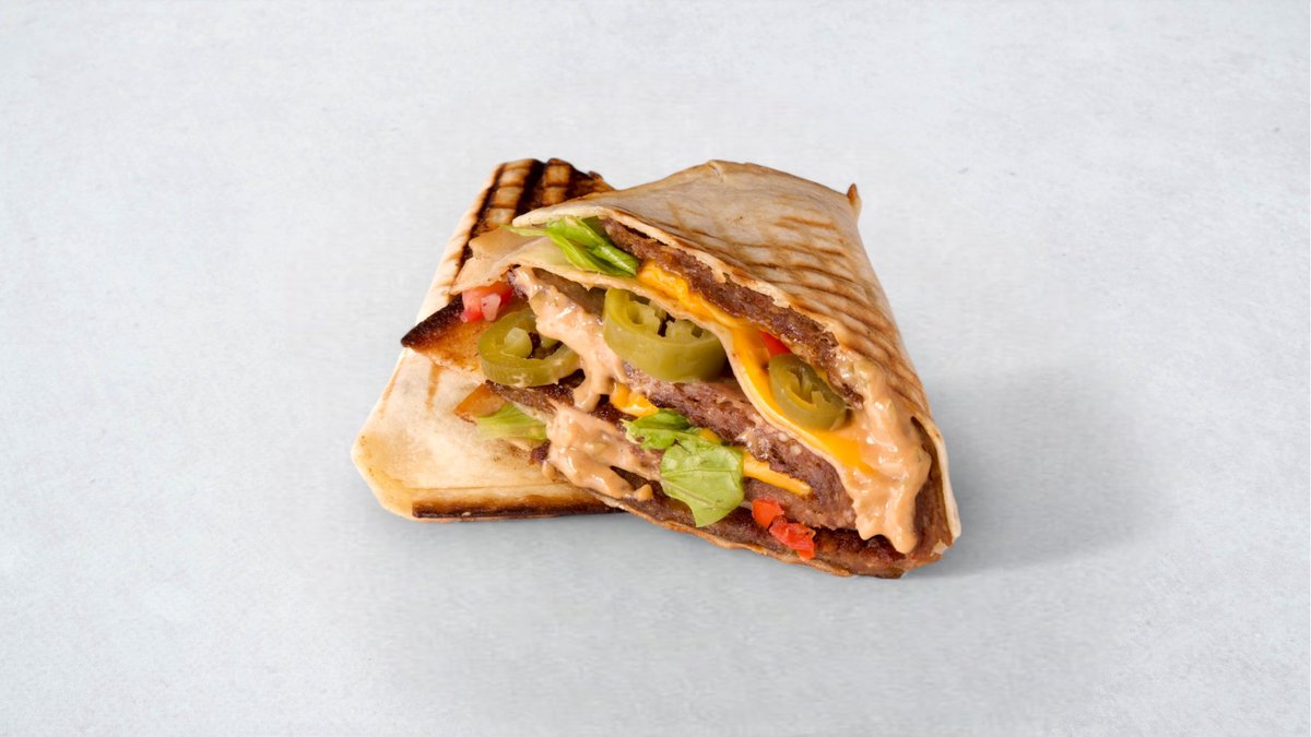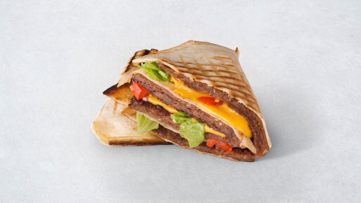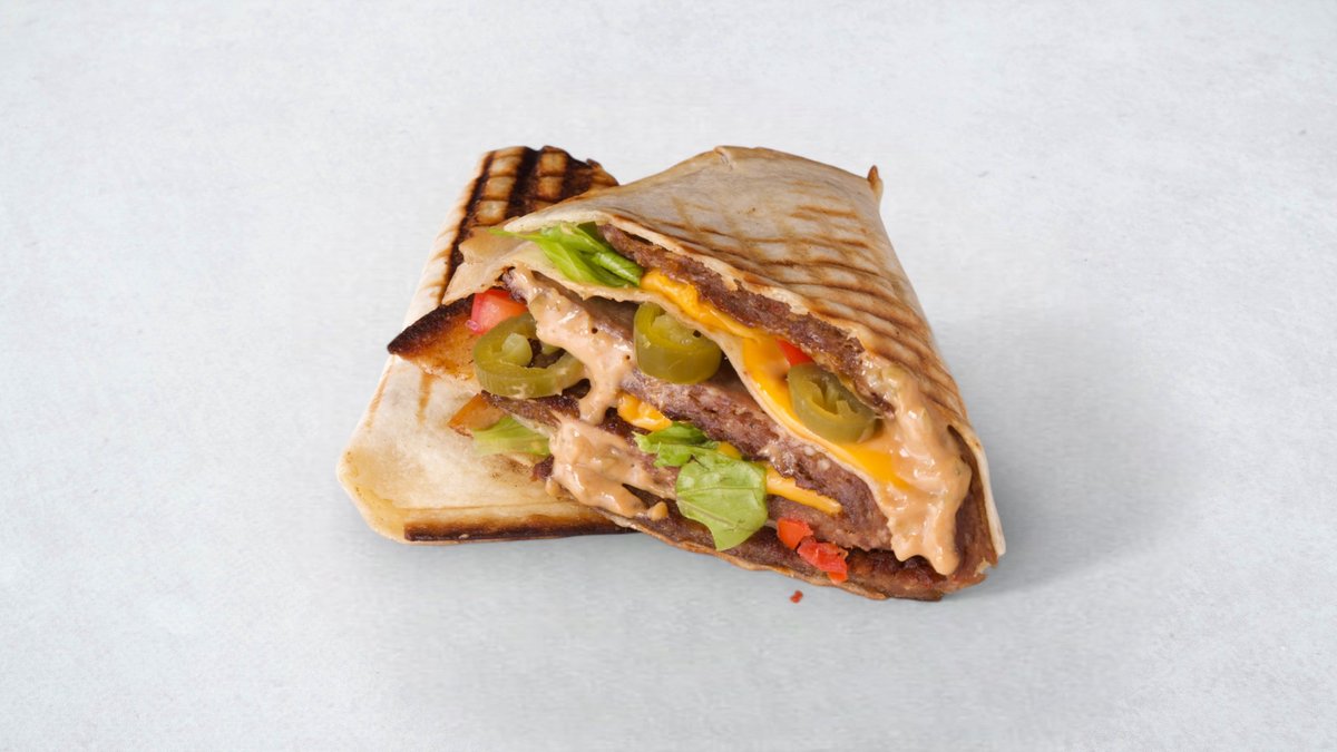 Pšenična tortilja, mljeveno 100% juneće meso (150 g), specijalni D-sauce umak sa sitnim komadićima kiselih krastavaca, relish (sitni komadići luka i rajčice), zelena iceberg salata, sir