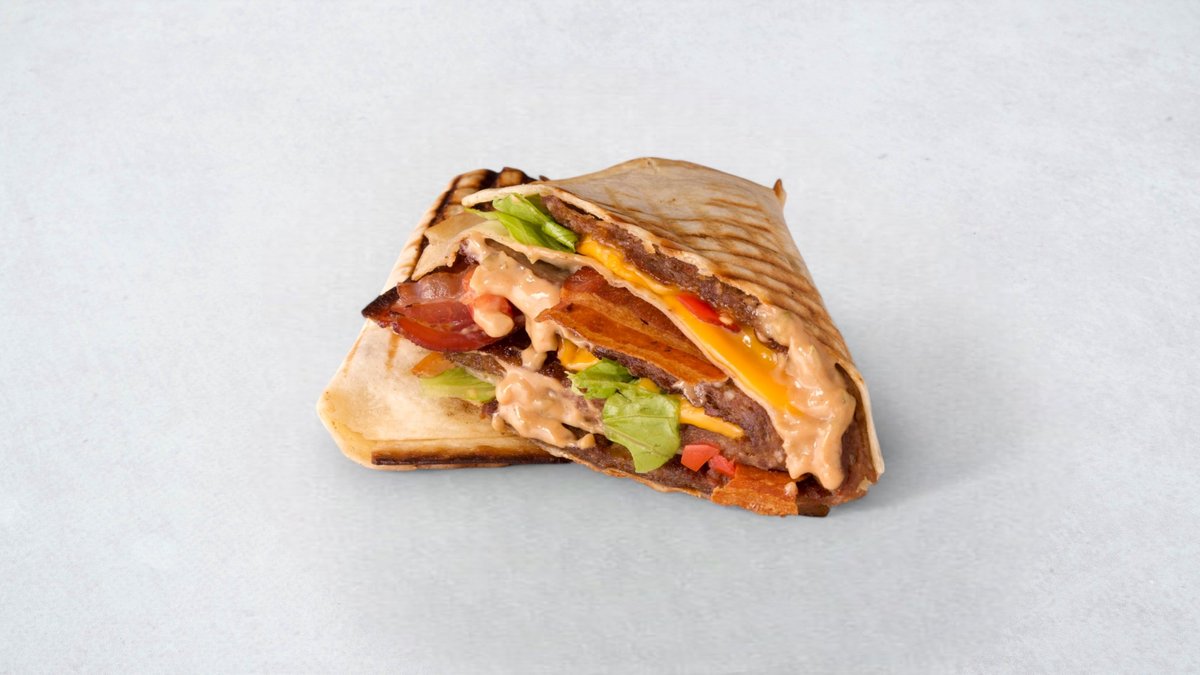 Pšenična tortilja, mljeveno 100% juneće meso (75 g), specijalni D-sauce umak sa sitnim komadićima kiselih krastavaca, relish (sitni komadići luka i rajčice), zelena iceberg salata, sir, slanina