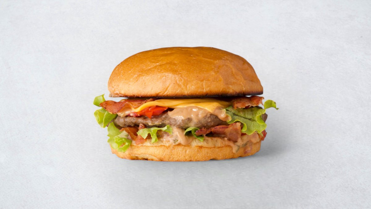 Pecivo, mljeveno 100% juneće meso (150 g), specijalni D-sauce umak sa sitnim komadićima kiselih krastavaca, relish (sitni komadići luka i rajčice), zelena iceberg salata, sir, slanina