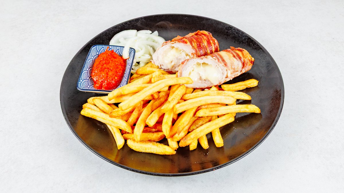 Pileći odrezak sa žara punjen sirom i omotan pršutom s pommes fritesom, lukom i salatom