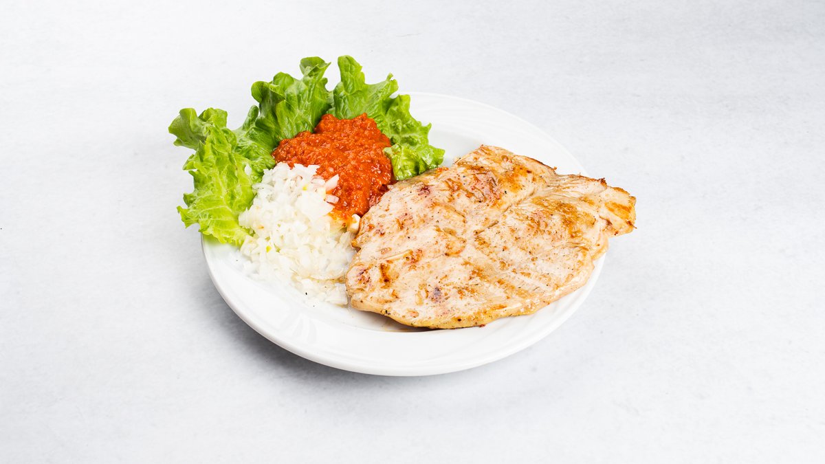 Puretina na žaru s pommes fritesom, kupus salatom i lukom